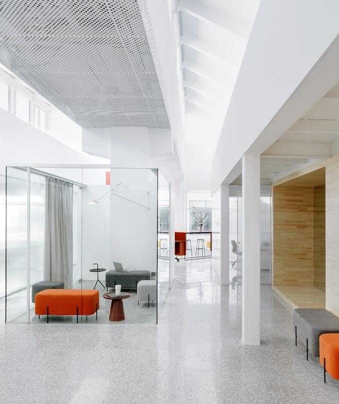 某創(chuàng)意園區(qū)辦公室裝修茶水間設(shè)計(jì):將茶水間放置在兩翼的樞軸上意圖在于是其成為辦公室的社交中心,同時(shí)可以通過(guò)全玻璃立面欣賞到花園景觀。茶水間的前面有一個(gè)服務(wù)區(qū),儲(chǔ)藏食品的同時(shí)設(shè)置了服務(wù)器室、門(mén)衛(wèi)室、浴室、淋浴間和洗滌區(qū)。辦公室的設(shè)計(jì)爭(zhēng)取較大化每個(gè)部門(mén)的利益: 例如會(huì)計(jì)和管理或許會(huì)需要一個(gè)非常私人的辦公室,又或?;?dòng)和溝通的部門(mén)需要一個(gè)開(kāi)放的空間配置。紅色密度板圍合出來(lái)的盒子隱藏著兩個(gè)CEO的辦公室,他們可以享受大棚子的自然光和全高窗戶(hù)的花園景觀。