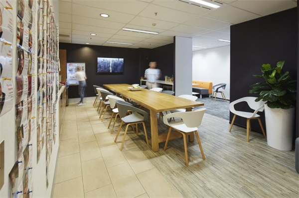 5、服裝公司辦公室裝修設計:接待處位于底樓的正門,設有休息室和會議空間,可容納訪客。接待區(qū)周圍的定制墻板模仿了織物的褶皺,并為零售品牌的工作場所提供了設計敘事。提供各種團體座位安排的所有團隊成員的共用食堂位于地下室。開放式辦公室和休息區(qū)沿著面向公園一側(cè)的全高立面玻璃排列,使員工在工作期間可以欣賞郁郁蔥蔥的綠色美景。玻璃隔斷用于將會議室、私人櫥柜與開放辦公室分隔開來,充分利用自然光線,創(chuàng)造一個透明通風的工作場所。白色、灰色和黑色的基本色調(diào)與天然的木材和石材表面作為重點,為工作場所的創(chuàng)造性工作創(chuàng)造了一個干凈和舒適的背景。墻面紡織面板和天花板護罩可確保共享空間和封閉空間所需的聲學特性。