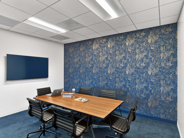 橡木定制的辦公家具和白色亞光鋼架、精挑細選的壁紙、雪白色的接待臺以及休閑茶水區(qū)的網(wǎng)狀編織吊燈。