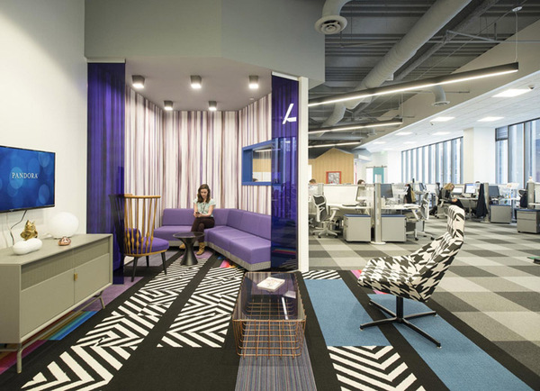 開放性的辦公區(qū),設(shè)計(jì)師使用餐廳質(zhì)感的訂制家具,取代以往的OA辦公家具,讓員工作業(yè)可以更加舒適愜意。設(shè)計(jì)師特別為業(yè)主規(guī)劃斜角天花及專業(yè)隔音系統(tǒng),讓每次聆聽音樂都是一場(chǎng)享受。