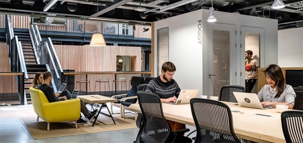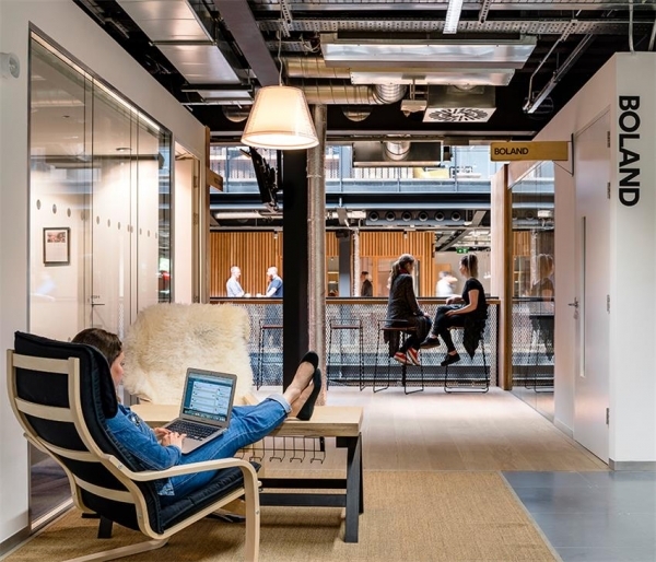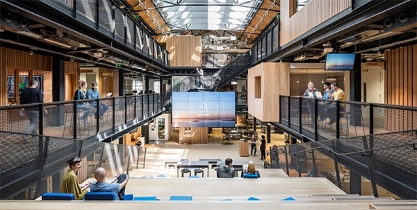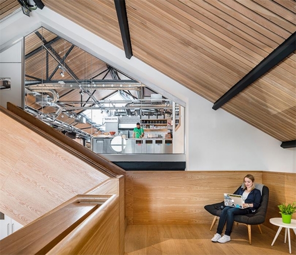 辦公室內(nèi)有29個鄰里單位,大型公共桌子取代了個人辦公桌。這些區(qū)域內(nèi)還包括了個人儲藏空間,一個或兩個高凳站立區(qū)域,以及一個沙發(fā)位。中心樓梯成為辦公室里的聚焦點。樓梯以“廣場”為名,把二層和地面層連接起來,使各樓層空間融為一體。多功能的樓梯能滿足多種用途,從能容納多達400人的會議和社區(qū)活動空間,到工作環(huán)境里的休息風格空間。