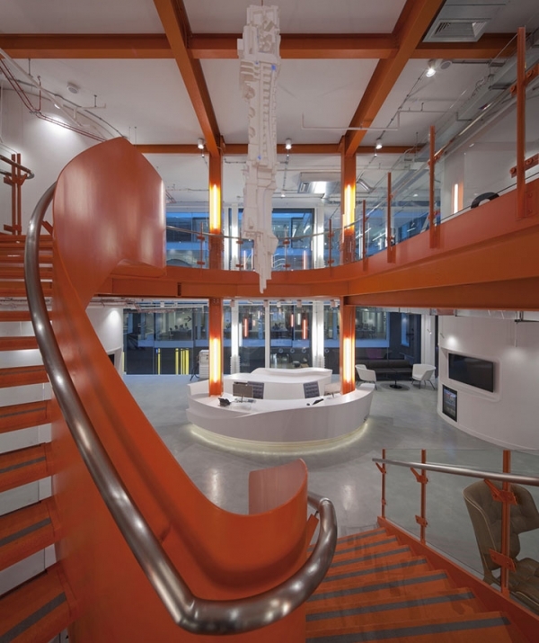 SEI總部辦公室裝修設(shè)計(jì)給人們帶來(lái)獨(dú)特的空間體驗(yàn),接待大廳一座定制的螺旋鋼樓梯和雕塑般的接待前臺(tái)。樓梯中間猶如宇宙飛船般的雕塑,是設(shè)計(jì)師嘗試用聚苯乙烯這種輕質(zhì)材料打造具有未來(lái)感的發(fā)光電塔.