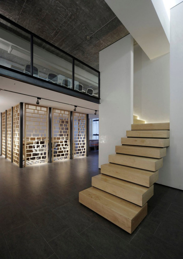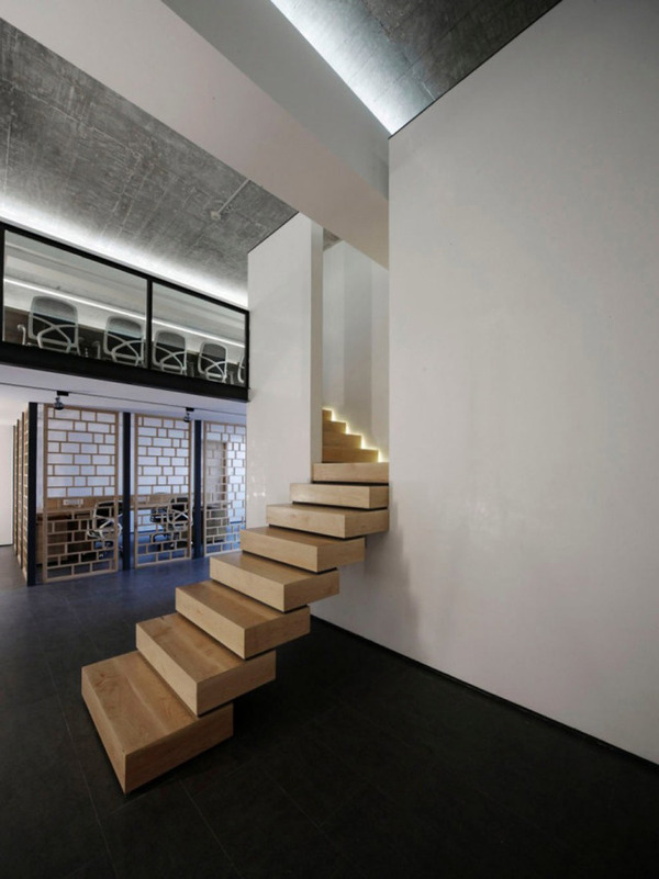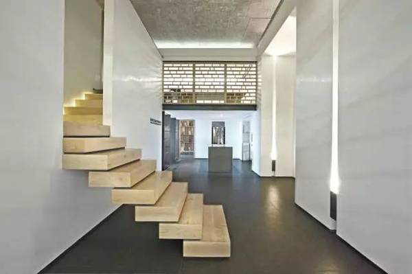 挑高的入口門廳中,地面運用了灰色仿古磚,原本白色的天花板表皮被鏟掉,露出原有的混凝土表情,打砂的方式使天花板既達到防塵的效果,又擁有特殊的細膩肌理。門廳中央為兩道白墻,白墻中間的細縫夾著一道窄窄的無扶手樓梯。這個看似冒險的設(shè)計實際上解決了屋頂建筑橫梁帶來的對閣樓人員流通的阻礙問題。