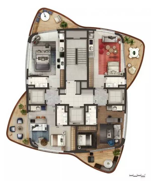 每個(gè)房間都有一個(gè)流線型的大陽(yáng)臺(tái)