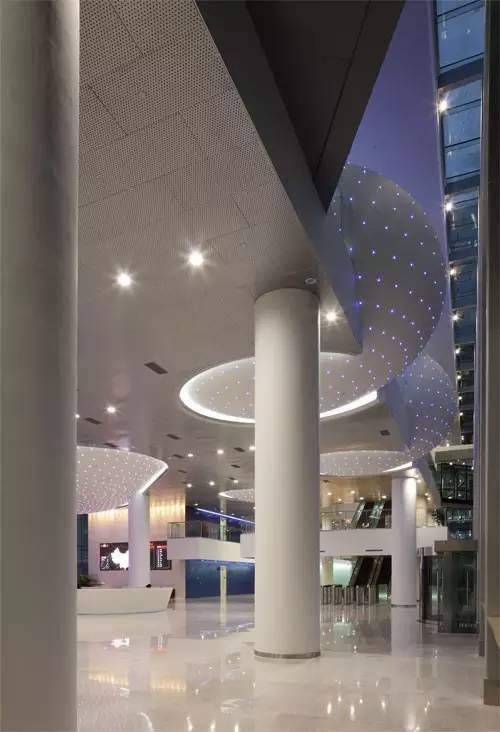 運用現(xiàn)代簡潔的設計手法,高雅明快的色調,精致和諧的材料,設計師成功營造出一個純粹干凈的國際化企業(yè)空間氛圍。中性高雅的色調成為空間的背景,而一些高科技的設備及材料:比如激光投射燈、穿孔金屬板的運用,則表現(xiàn)出信息時代敏銳、高速的特色。通過合理組織參觀流線,有效串聯(lián)功能空間,設計強化了室內(nèi)環(huán)境與內(nèi)院環(huán)境、室外環(huán)境的聯(lián)系與互動,做到空間次序明確同時各部門又各具特色。建筑良好的視線及引入建筑的陽光、綠化,則充分與小型討論區(qū)、會議單元、咖啡區(qū)休息區(qū)結合起來,使辦公環(huán)境輕松化、特色化、人性化。