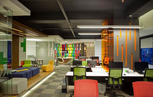 辦公區(qū)域的設(shè)計(jì)更有特點(diǎn),天花設(shè)計(jì)成網(wǎng)狀造型,線條感特出,天花吊頂由兩種色彩不規(guī)則的幾何體組成,設(shè)計(jì)師把它們合理排列,表現(xiàn)出滿滿的藝術(shù)氣息。設(shè)計(jì)師辦公桌顏色搭配也十分新穎,風(fēng)格與主色調(diào)統(tǒng)一,也選用彩色搭配,顛覆了以往單調(diào)的純色系列,這個(gè)創(chuàng)新十分大膽,創(chuàng)意無(wú)限。整個(gè)空間的設(shè)計(jì)用天花的蘋(píng)果綠和多彩的墻身色調(diào),使整個(gè)辦公區(qū)表現(xiàn)出輕松、愉快的感覺(jué)。