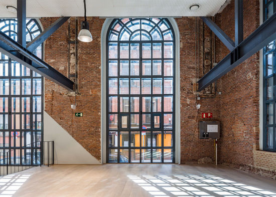 Jump Studios 需要改造的是位于馬德里的一所 19 世紀(jì)的電池工廠,有五層樓高,一些地方還保留了老式的紅磚墻。他們在對(duì)整個(gè)樓進(jìn)行完全檢查后對(duì)區(qū)域做出了重新的布局,在北邊開辟了一個(gè)新的入口,用了有現(xiàn)代感的黑色金屬且貫通兩層。