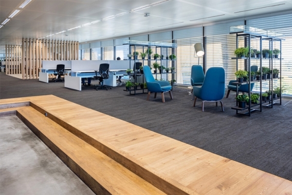 高低錯(cuò)落的地面豐富了空間形態(tài)。溫暖的木色、混凝土地面、暗色系墻面和家具,簡(jiǎn)潔的材質(zhì)對(duì)比卻營(yíng)造出豐富的視覺效果和時(shí)尚辦公空間。開放辦公區(qū)沿窗而設(shè),遠(yuǎn)處蔥蘢美景盡收眼底。