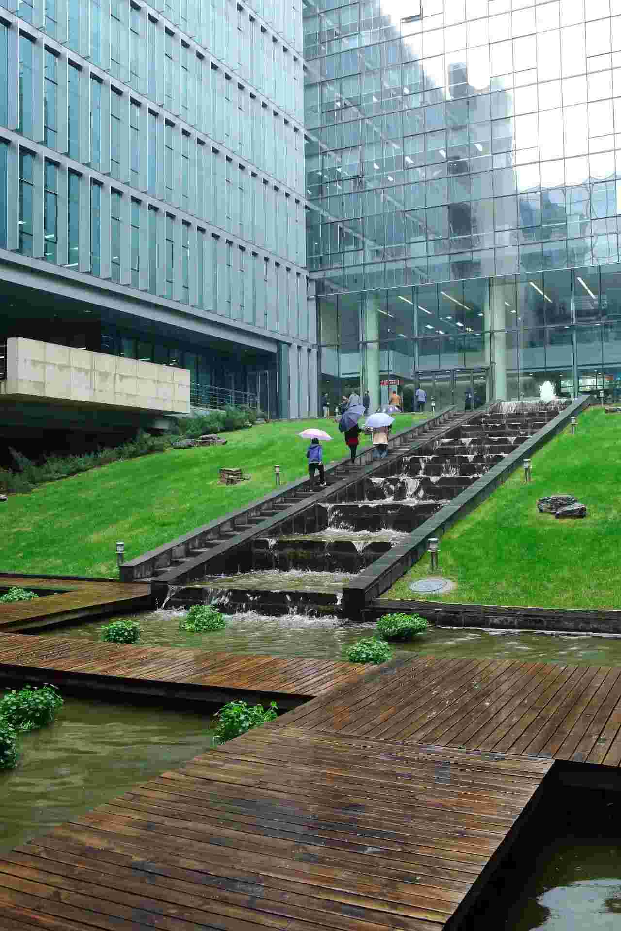 這五棟樓包圍著一個有山有水的花園。負(fù)一樓是休閑餐飲區(qū),有不同菜系的中餐廳、西餐廳、面包坊、發(fā)型屋、按摩屋等等。樓內(nèi)還有健身房、室內(nèi)攀巖館等。工作累了的員工可以隨時來休息,換換腦子。
