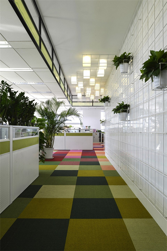 2000平方辦公室裝潢以彩色玻璃隔斷的顏色分出四個會議區(qū)域,紅黃藍綠。每個區(qū)域中的顏色又都有十幾種微妙的變化,共計54種彩色玻璃的顏色,在環(huán)形走廊上完成色彩的循環(huán)。在墻面上,設(shè)計師用白色瓷磚做辦公空間內(nèi)環(huán)形走道的墻面。利用材料的反射性能,彩色光暈在空間中能流動起來。像水彩在紙上洇開一樣,形成氤氳彌漫的效果。同時,考慮到辦公空間的進深較大,白色瓷磚能夠反射外部光線,增加室內(nèi)空間的光亮度。