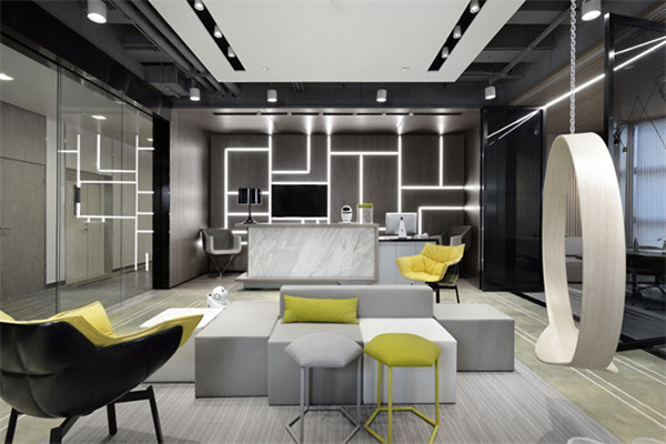 3、辦公室前臺(tái)作為辦公室裝修設(shè)計(jì)中重要的一部分,更要實(shí)現(xiàn)功能與美感的高度統(tǒng)一,旁邊可配備招待客人的小茶幾和洽談椅,為辦公室營造出一種輕松的氛圍。讓來訪者感到放松,更能促進(jìn)合作。