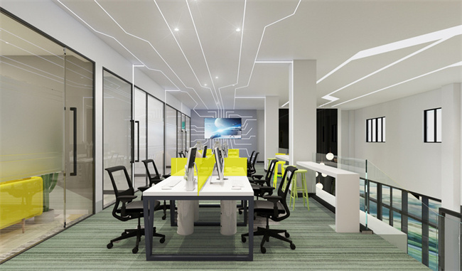 3、550平科技辦公室設(shè)計(jì)裝修:空間分成兩層,為了更好的滿足甲方的各種需求,設(shè)計(jì)師利用部分硬裝造成一種空間上穿插的效果,達(dá)到視野上的開闊性。色彩上面以客戶要求表現(xiàn)活力(綠色調(diào))為主,再以色彩上的搭配,營造出一種賦予有生命力、活力、五彩斑斕的公司。再配以展示電子產(chǎn)品技術(shù)為主題的設(shè)計(jì),達(dá)到客戶想要的效果及體驗(yàn)。