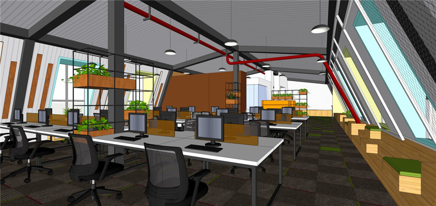 該項目*吸引我們的是斜坡式建筑頂,設(shè)計師決定保留原建筑裸露天花是本案設(shè)計的開始。設(shè)計任務(wù)是建造一個涵蓋多部門、多功能,年輕時尚的辦公環(huán)境。