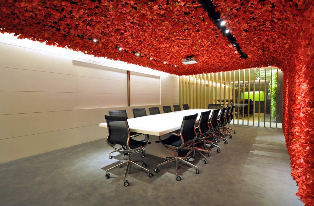 令人驚艷的會議室,那滿目鮮艷欲滴的紅色花卉彌漫了大半的會議室空間;小型會議室則以美麗的蝴蝶為設(shè)計主題,疏密的布局令空間充滿動感;