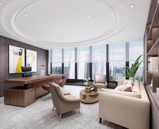2、現(xiàn)代輕奢風(fēng)辦公樓接待大廳裝修:整個辦公空間分為頂、墻、地三個部分,頂面以圓形和橢圓形疊級吊頂造型裝飾,輕松、休閑的燈光營造氛圍,在接待客人談生意時,裝修也能體現(xiàn)一家老板的品味與性格,還有該公司的實力,公共區(qū)域墻面采用高檔木飾面板裝飾,地面則是地毯滿鋪??偨?jīng)理辦公室裝修設(shè)計中重要的是超大的落地窗,總經(jīng)理工作上的壓力往往是常人難以感同身受的,站在三十多樓的高樓里,可以一覽城市風(fēng)光,居高臨下俯視這座城市,眺望遠方舒緩內(nèi)心的壓抑。