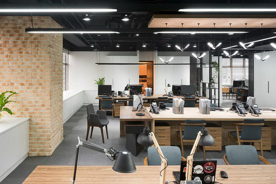 3、現(xiàn)代時(shí)尚的主題辦公室設(shè)計(jì)案例:以現(xiàn)代時(shí)尚的主題表達(dá)團(tuán)隊(duì)形象,透過空間的通盤整合,延伸辦公場域的使用尺度,也讓行走動線更流暢??臻g中運(yùn)用溫暖的元素,如文化石與天然木質(zhì)等,細(xì)膩營造場域內(nèi)的質(zhì)樸與舒適感。設(shè)計(jì)師以整排矮柜的方式保留對外采光,兼具收納機(jī)能與對外的流通性。