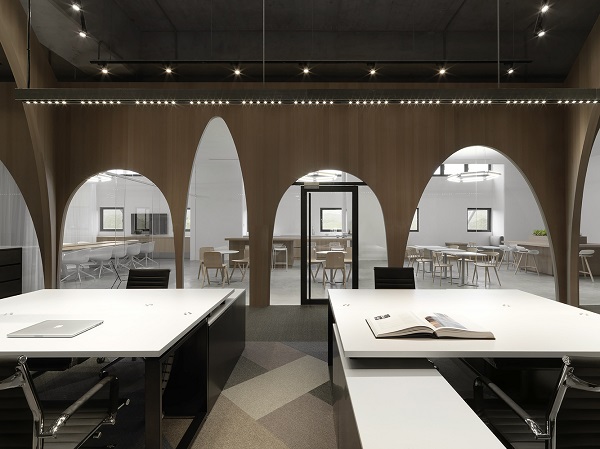 2、考慮到辦公室裝修需要的空間性。設(shè)計(jì)師結(jié)合自身創(chuàng)意,設(shè)計(jì)了一個(gè)個(gè)用柱子支撐的空間結(jié)構(gòu),就像巴黎教堂的穹頂一般。巨大的柱子帶來的大跨度和場地的高屋頂以及隨處可見的鏡面和玻璃隔板,創(chuàng)造出一個(gè)兼具創(chuàng)造性和實(shí)用性的辦公室空間。整個(gè)辦公室設(shè)計(jì)被稱為“修道院”,包括一個(gè)L型的大廳,周圍的拱廊,一面面對建筑的室內(nèi)并且可以遠(yuǎn)望的庭院。通過創(chuàng)造人體尺度的辦公空間小組和放松的其他區(qū)域,這項(xiàng)辦公室設(shè)計(jì)既滿足了辦公所需的私密性,同時(shí)又保持了一種中性的工作環(huán)境。
