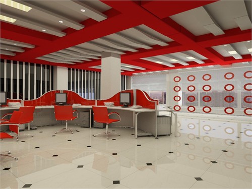 1、時尚服裝公司辦公室門廳裝修設計:采用大紅色為主色調(diào)凸顯了服裝設計公司的一種很奔放的一種美感。前臺和休息區(qū)是一個整體的空間,利用展示架把它們成功的分成了兩個區(qū)域,互相獨立又協(xié)調(diào)統(tǒng)一。紅色的亞克力燈也是很搶眼具有一種很時尚現(xiàn)代的美感并且與會議室互相呼應使整個設計做的比較整體。會議室的窗洞是采用像服裝樣式的異性口開洞凸顯了整個設計主題。辦公空間整個設計用簡約的線條以及時尚的家具打造一種很熱烈奔放富有激情的公司氛圍。