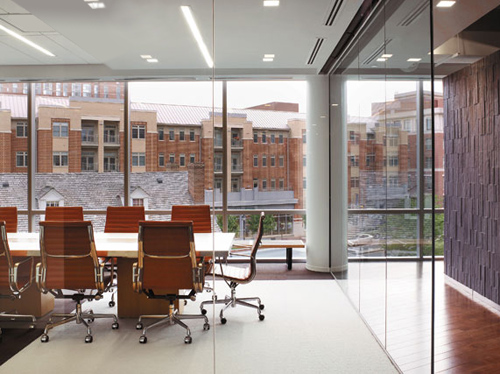 會議椅與定制的會議桌,會議桌面層為烤漆玻璃并嵌入條形白色橡木。