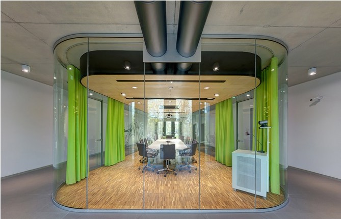 辦公室設(shè)計效果圖,室內(nèi)設(shè)計上,建筑師放棄了吊頂,將混凝土天花板直接暴露。室內(nèi)辦公區(qū)采用了大面積的玻璃窗,不僅光線明亮,也與室外發(fā)生更緊密的聯(lián)系。部分空間為了防止過熱以及過多陽光射入,配備了不妨礙用戶欣賞室外風(fēng)景的百葉窗。