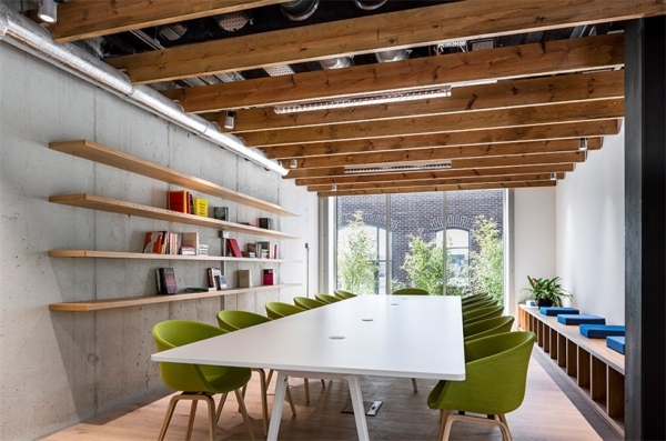 辦公室內(nèi)有29個鄰里單位,大型公共桌子取代了個人辦公桌。這些區(qū)域內(nèi)還包括了個人儲藏空間,一個或兩個高凳站立區(qū)域,以及一個沙發(fā)位。中心樓梯成為辦公室里的聚焦點。樓梯以“廣場”為名,把二層和地面層連接起來,使各樓層空間融為一體。多功能的樓梯能滿足多種用途,從能容納多達400人的會議和社區(qū)活動空間,到工作環(huán)境里的休息風格空間。