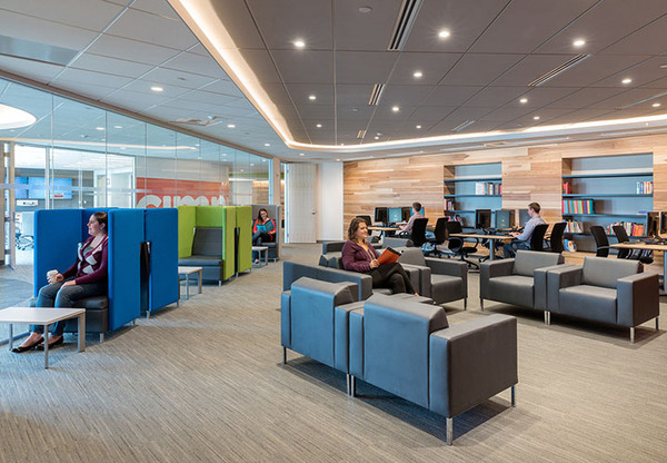 除了協(xié)作空間,設(shè)計(jì)團(tuán)隊(duì)還設(shè)計(jì)了一處閱覽空間,給團(tuán)隊(duì)成員提供一處寧?kù)o的工作區(qū)。為了解決開(kāi)放式空間所帶來(lái)的聲學(xué)問(wèn)題,設(shè)計(jì)采取多種措施確保聲音的隱私性,以及視聽(tīng)會(huì)議室和人多的房間的隔音性能。