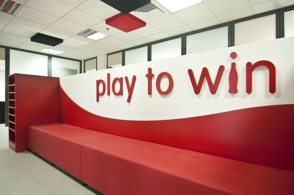 紅色代表著激情與夢想,傳遞出一種積極向上的工作與生活態(tài)度。辦公區(qū)域則引入了大量的規(guī)則幾何體設(shè)計,給人一種彩色拼裝積木的視覺感受,質(zhì)感中不失童真與樂趣。而“Excel、Amaze、Play to Win”等大幅設(shè)計字體的運用,不僅起到了很好的裝點空間效果,也是不同工作區(qū)間的醒目劃分。