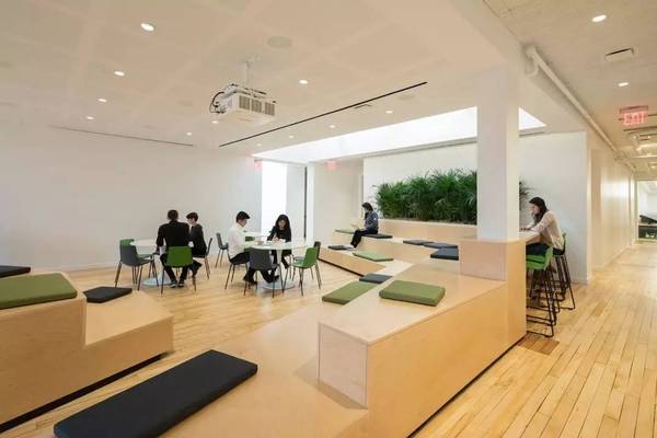Sn?hetta對Slack新紐約空間設計的靈感來源于**特色的城市小院。從Paley Park的室內景觀中吸取靈感,竹植物提供自然的隱私屏幕,并為綠化帶來空間。現(xiàn)有四個天窗與放大,八字天花板大大增加了室內以及內部小庭院的自然光線。