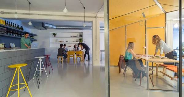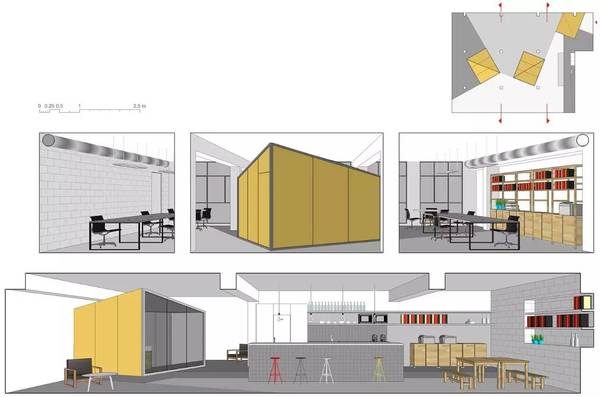 此空間是一個(gè)由鋼筋混泥土柱子和懸梁支撐的300平米大開敞空間。結(jié)構(gòu)由三個(gè)中心線組成,清楚地配備了所需的功能計(jì)劃:兩個(gè)辦公室位于相對(duì)的兩側(cè),公共會(huì)議室和休息區(qū)在中心。