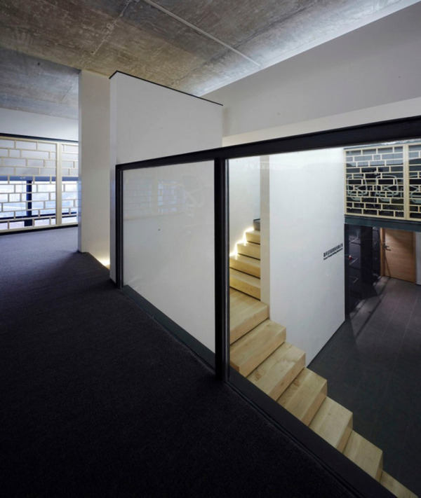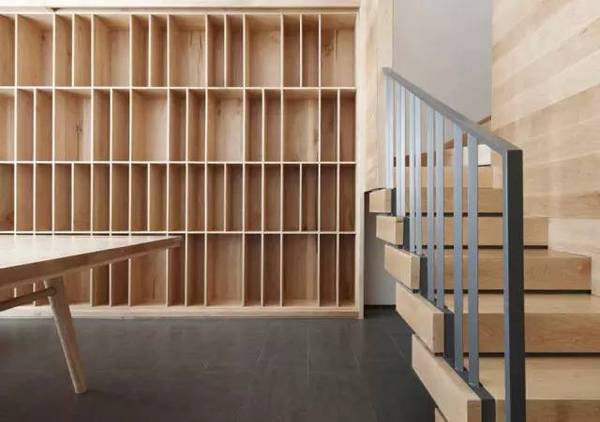 挑高的入口門廳中,地面運用了灰色仿古磚,原本白色的天花板表皮被鏟掉,露出原有的混凝土表情,打砂的方式使天花板既達到防塵的效果,又擁有特殊的細膩肌理。門廳中央為兩道白墻,白墻中間的細縫夾著一道窄窄的無扶手樓梯。這個看似冒險的設(shè)計實際上解決了屋頂建筑橫梁帶來的對閣樓人員流通的阻礙問題。