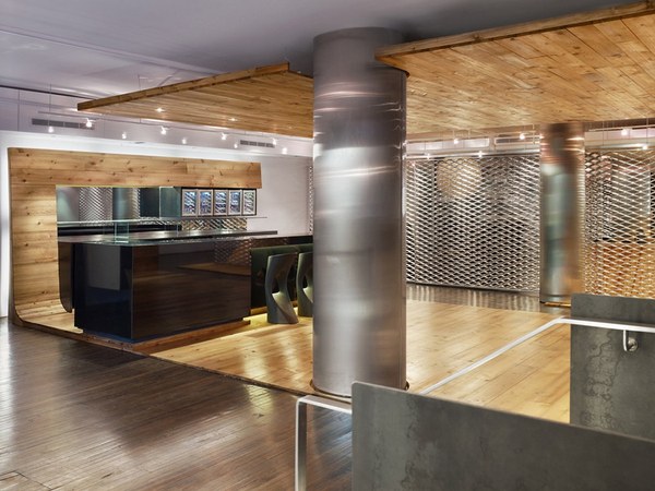 不同于其他各種材質(zhì)、各種類型的屏風(fēng)和隔斷,設(shè)計(jì)師選用鋁網(wǎng)篩孔這一特殊的建筑材料將吧臺(tái)與開放式工作區(qū)巧妙分隔。