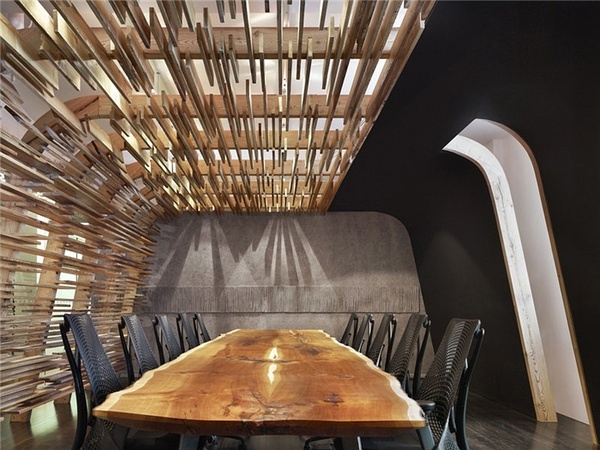 會(huì)議室的墻面由毛氈與黑板以及落葉松木條板組成,無(wú)序的條板構(gòu)造像是牛身體內(nèi)的經(jīng)脈。空間結(jié)構(gòu)如同一艘小船或原始人居住的棚屋。
