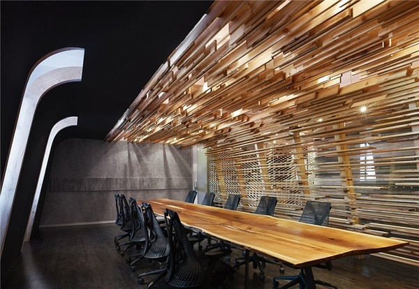 直線造型構(gòu)成的辦公區(qū)域,木飾面由地面而起演化成辦公桌,攀沿至墻面,再到頂面折回,猶如一條絲帶在空間蜿蜒,溫暖的木色與肌理自然圍合成一個(gè)舒適溫馨的工作區(qū)。