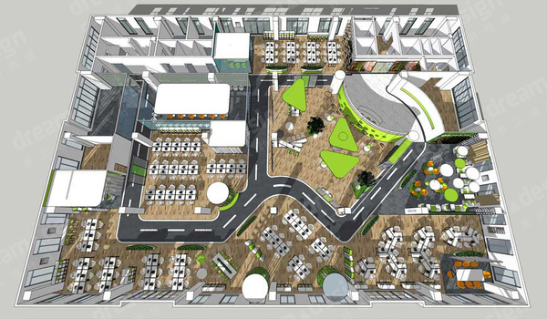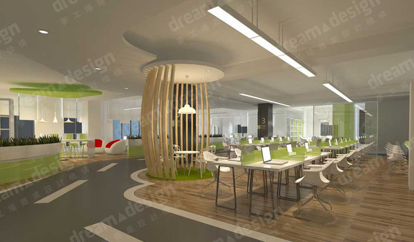 考慮到本案不同于普通辦公室,在設(shè)計(jì)上拋開了傳統(tǒng)的水平線和垂直線的理念,平面和空間及造型上都用斜切方式處理,使之富有動(dòng)感和韻律。內(nèi)空間造型靈活多樣,充滿創(chuàng)意和趣味形設(shè)計(jì)--接待區(qū)設(shè)計(jì)師摒棄了有菱角的線條和繁復(fù)顏色,改用白色調(diào)和優(yōu)美弧形,討論區(qū)以“小鳥巢”為主題設(shè)計(jì),室內(nèi)小樹裝飾,讓整個(gè)空間多了份小清新。值得一提的是,設(shè)計(jì)師用跑道代替走道,讓人仿佛置身于時(shí)間旅行,激勵(lì)起員工的動(dòng)運(yùn)細(xì)胞及團(tuán)隊(duì)之間的激情,能量倍增。