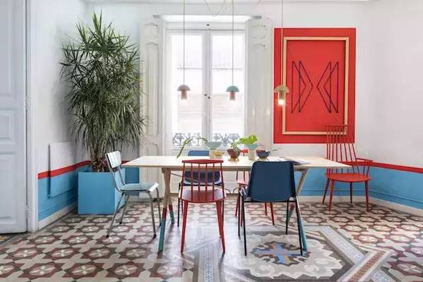 雖然都是白色基調打底的空間,但每一個卻都個性張揚,比如鋪滿天藍色油漆的墻面搭配以大大小小的黑白裝飾畫,圓形、拱形、直線以及黑白條紋拼貼出來的彩色幾何墻面,紅藍主題的餐廳空間輔以大面積花磚鋪地等等。