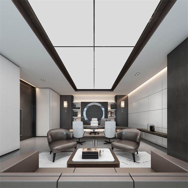 3、集團總裁、總經(jīng)理等領導辦公室裝修設計直接代表著企業(yè)的形象和實力。案例中展示的總裁辦公室為新中式風格,總裁辦公室既有辦公區(qū)也有接待區(qū),方便了總裁接待客戶。新中式風格既凸顯了總裁的儒雅,也體現(xiàn)了企業(yè)務實、內(nèi)斂的特性。
